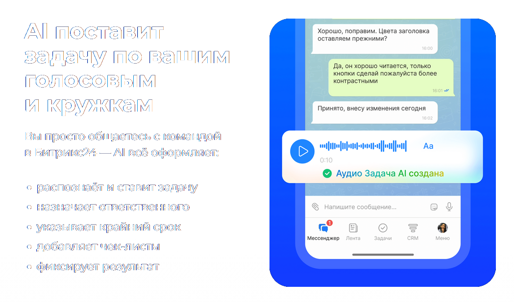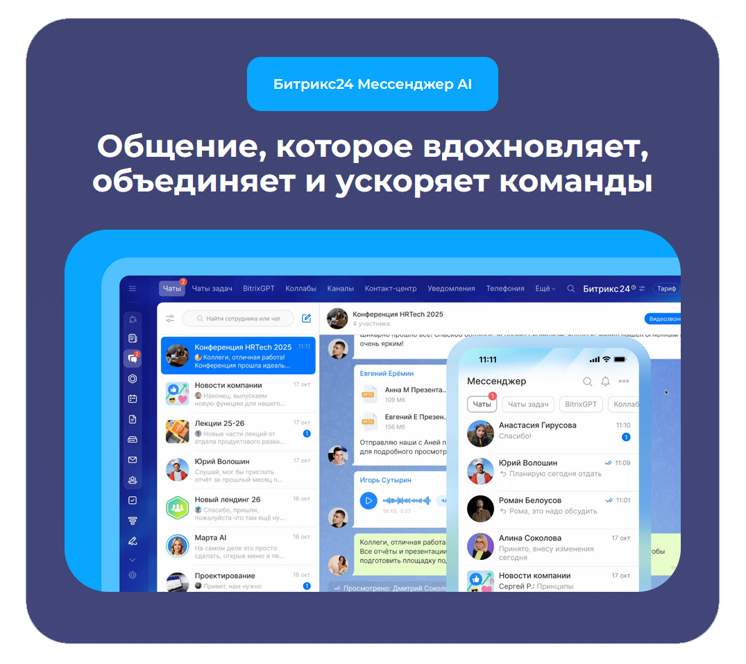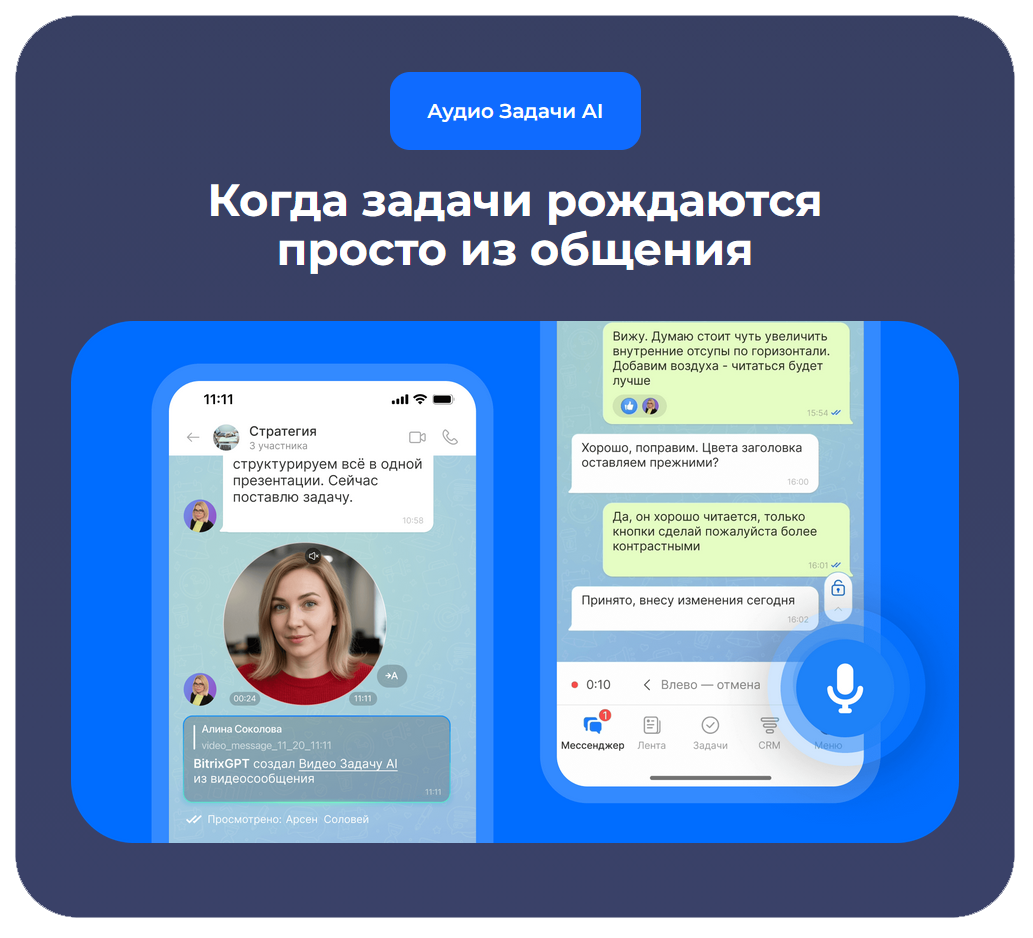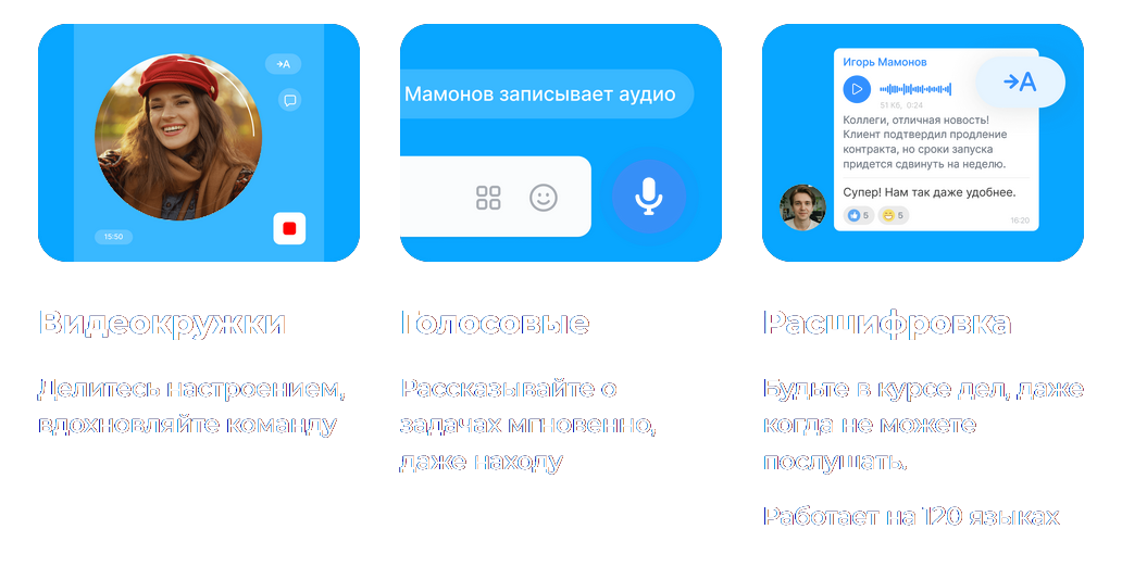 Чаты и видеозвонки, объявления, комментарии к задачам помогают быстро решать рабочие вопросы. Лайки, благодарности, опросы добавляют эмоциональную связь и повышают мотивацию.