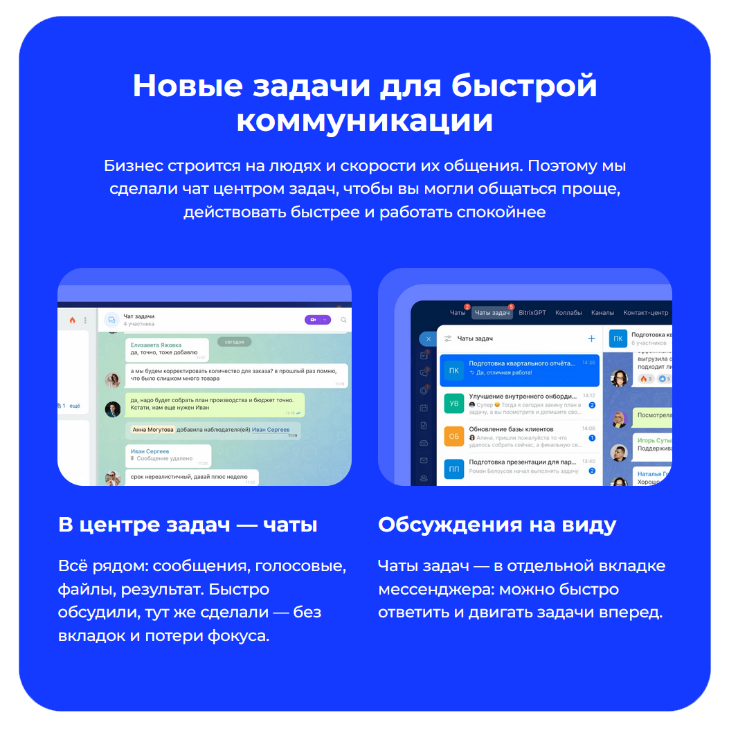 Неограниченное количество рабочих групповых и индивидуальных чатов у вас под рукой — а также Открытые линии, диалоги с внешними пользователями, обмен файлами и уведомления.