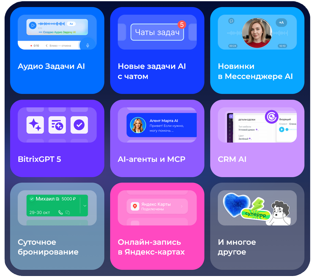 Больше не нужно жонглировать сервисами, раздавать к ним доступы и пересылать неизвестные ссылки. Все уже есть в Битрикс24